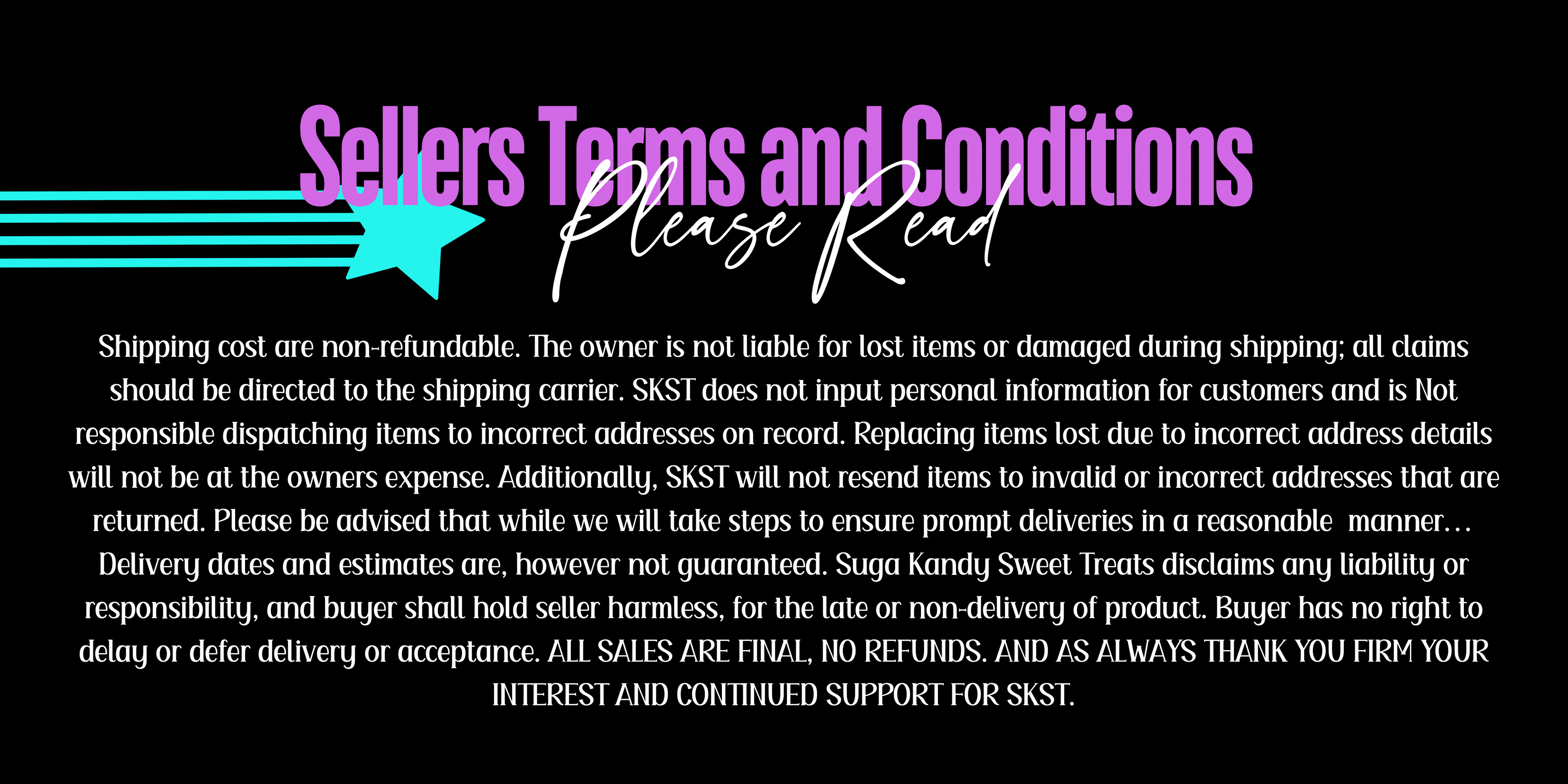 Purchased orders will be processed and shipped on Mondays, Tuesdays, and Wednesdays (excluding HOLIDAYS!!). Please allow up to 7 - 10 business days to receive your tracking information. In the event of ANY delays, you will be notified accordingly. For any additional information please email us at suga@sugakandysweettreats.com
